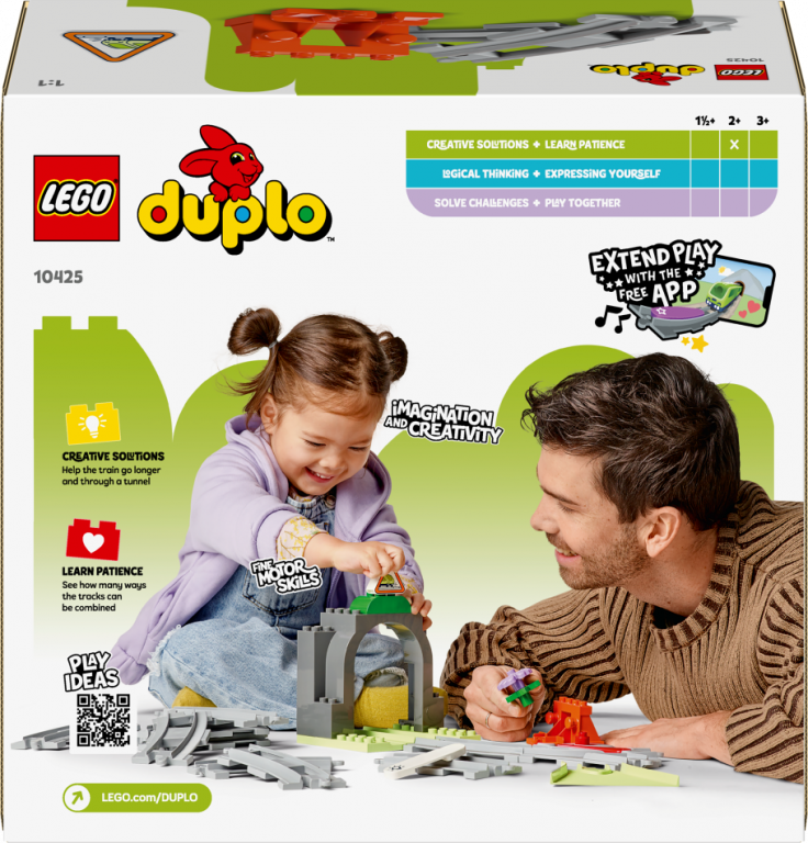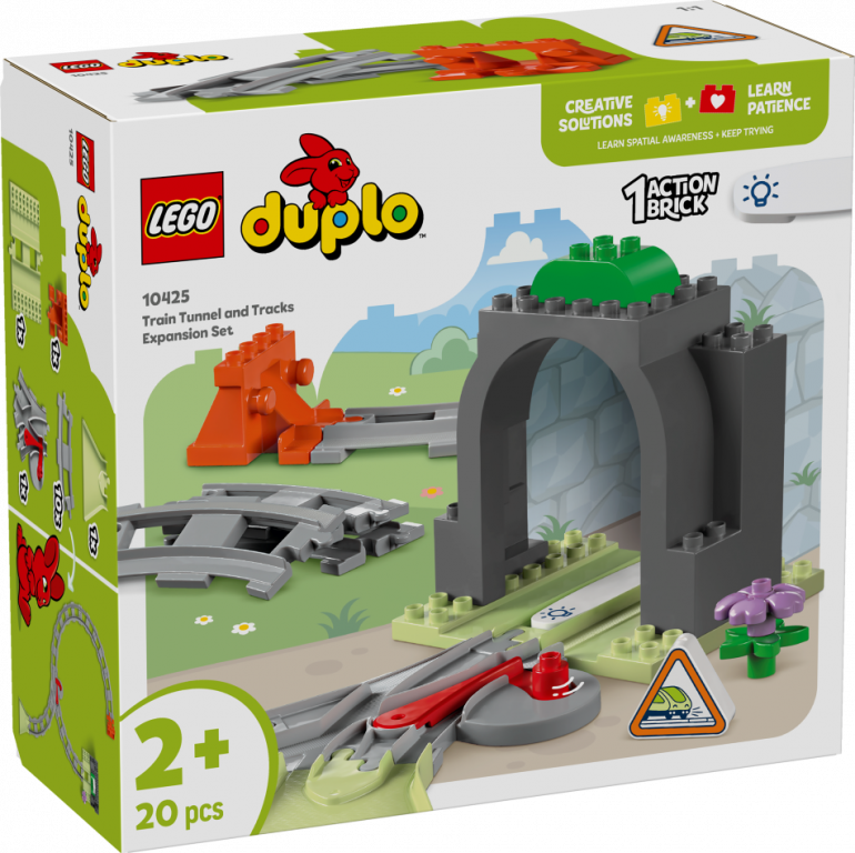 Paplašini mazuļu vilcienu piedzīvojumus ar Vilcienu tuneļa un sliežu paplašinājuma maršruta komplektu (10425) mazuļiem. Pirmsskolas vecuma bērni no 2 gadu vecuma paplašina savus mācīšanās piedzīvojumus, pievienojot tuneli un papildu sliedes saviemLEGO® DUPLO® Pilsēta interaktīvajiem rotaļu vilcienu komplektiem (10427 un 10428, jāiegādājas atsevišķi).