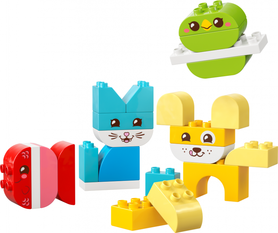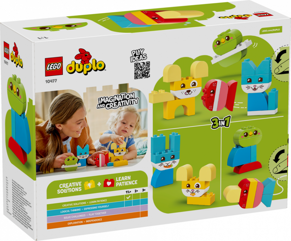 Piepildiet rotaļu laiku ar krāsām un radošumu ar LEGO® DUPLO® Mani pirmie 3 vienā radošie jaukie mājdzīvnieki (10477) dzīvnieku rotaļlietu. Šī jaukā mājdzīvnieku rotaļlieta bērniem no 18 mēnešu vecuma piedāvā 8 dažādas būvēšanas iespējas ar vienu un to pašu klucīšu komplektu. Izmantojot 24 viegli lietojamos klucīšus, kas īpaši izstrādāti pašiem mazākajiem bērniem, mazie būvētāji var izvēlēties izgatavot suņu, kaķu, putnu, trušu, peli un zivtiņu figūriņas. Dažās no šīm dzīvnieku rotaļlietām maziem bērniem tiek izmantoti vienkrāsaini LEGO DUPLO klucīši. Mazie būvētāji var iemācīties šķirot pēc krāsas, lai izveidotu savu mājdzīvnieku, pabeidzot figūru, pievienojot draudzīgu dzīvnieka seju. Šī mazā dāvana, kas ir pilna ar izglītojošām aktivitātēm mazuļiem, mudina mazuļus attīstīt koncentrēšanās spējas un neatlaidību, izmēģinot dažādas klucīšu izvēles, lai izvēlētos pareizos klucīšus dzīvnieka pabeigšanai. Vai arī viņi var izmantot savu radošumu, lai paši izveidotu iedomātu radību! Satur 24 detaļas.