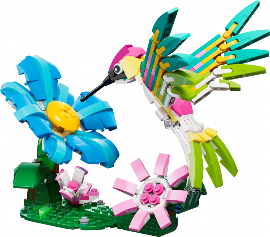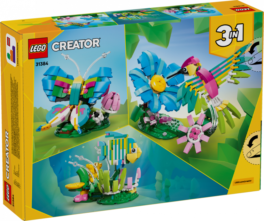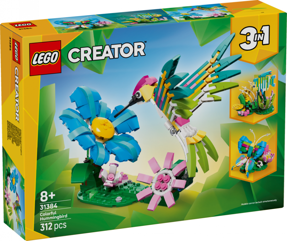 Meitenes un zēni no 8 gadu vecuma, kam patīk dzīvnieki, var izspēlēt burvīgus stāstus ar būvējamo rotaļlietu LEGO® Creator "Trīs vienā" Savvaļas dzīvnieki: Krāsainais kolibri (31384). Šis iespaidīgais dzīvnieku figūru komplekts bērniem piedāvā 3 dažādus būvēšanas variantus ar vieniem un tiem pašiem klucīšiem. Viņi var izvēlēties uzbūvēt kustīgu kolibri dinamiskā lidojuma pozā uz pamatnes ar skaistiem ziediem. Pēc tam to var pārveidot par tauriņu uz statīva ar ziediem vai tropu zivi uz statīva ar zemūdens augiem. Pēc būvēšanas un rotaļāšanās jebkuru no rotaļu dzīvniekiem var lepni izlikt apskatei kā skaistu dekoru par dabas tematiku. Šis LEGO Creator "Trīs vienā" komplekts iedvesmos mazos prātotājus, un tā būs lieliska dāvana bērniem, kampatīk daba un skaisti dzīvnieki. Bērni katru rotaļu komplektu var būvēt ar pārliecību, izmantojot lietotni LEGO Builder – tajā var tuvināt modeļus un sekot līdzi progresam ar viegli izpildāmām digitālām instrukcijām. Ņem vērā, ka modeļus nevar būvēt vi enlaikus. Komplektā ir 312 detaļas.