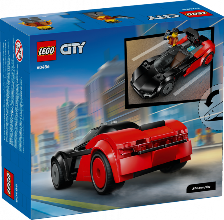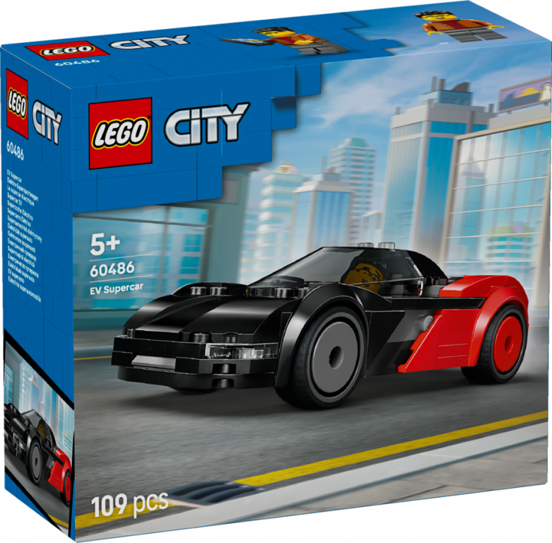 Iepriecini mazo elektroauto entuziastu ar LEGO® City Elektriskais superauto (60486) būvēšanas komplektu bērniem no 5 gadu vecuma. Šis viegli uzbūvējamais elektriskā superauto modelis ir aprīkots ar reālistiskām detaļām rotaļām un apskatei, tostarpelegantu, aerodinamisku virsbūvi, ko rotā koši sarkana un melna krāsu shēma, zema profila gumijas riepas, aizmugurējo lukturu josla un tonēts kabīnes pārsegs. Bērni var atvērt aizmugurējo lūku, lai piekļūtu akumulatora blokam, un nolikt vadītāja minifigūru pie stūres, lai nodotos stundām ilgām, dinamiskām rotaļām un tēlainai stāstu stāstīšanai. Šis nelielā rotaļu auto komplekts ir lieliska dāvana dzimšanas dienās vai kā pārsteigums zēniem un meitenēm, kam patīk moderni elektroauto un LEGO komplektu būvēšana. Bērni var pievienot šo komplektu citiem (jāiegādājas atsevišķi) no LEGO City klāsta, lai gūtu vēl plašākus piedzīvojumus. Bērni var būvēt šo rotaļu elektroauto ar pārliecību, izmantojot lietotni LEGO Builder — tajā viņi var tuvināt modeļus un sekot līdzi progresam ar viegli izpildāmām digitālām instrukcijām. Komplektā ir 109 detaļas.