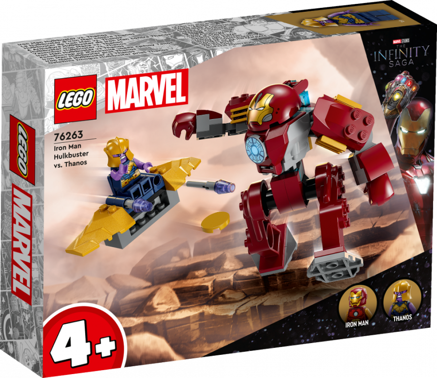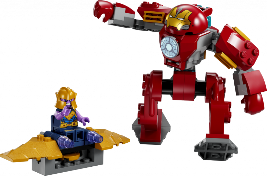Balstīts uz Marvel Studios filmu “Atriebēji: Bezgalības karš”, šis rotaļu komplekts apvieno Iron Man un viņa robotu kopā ar ļaundari Thanos un viņa lidaparātu. Hulkbuster robots ir pilnībā kustināms, un tas ietver sēdvietu Iron Man minifigūrai. Lidaparātam ir piestiprināts disku šāvējs un sēdvieta Thanos minifigūrai. Kārbas iekšpusē katra klucīšu paciņa ietver gatavu modeli un varoni, ko bērni var salikt, lai sāktu rotaļāties uzreiz. Krāšņs, ilustrēts stāsts kalpo kā būvēšanas un rotaļu pamācība, un divi robota kāju sākuma klucīši atvieglo būvēšanu. Papildus digitālai jautrībai būvētāji var tuvināt un grozīt komplektus trīs dimensijās, un sekot līdzi savam progresam aizraujošajā, intuitīvajā lietotnē LEGO Builder.