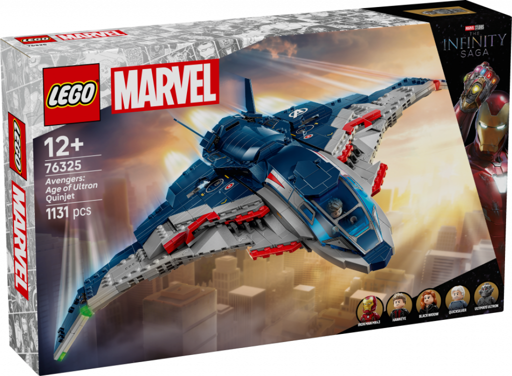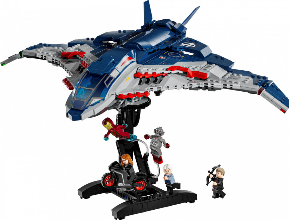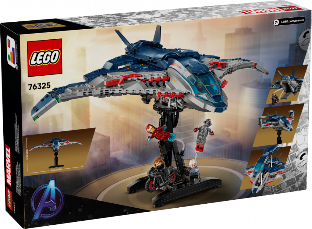 Uzbūvējamo Quinjet modeli papildina 5 minifigūras: Black Widow ar motociklu, Dzelzs vīrs, Quicksilver, Visvarenais Ultrons un Hawkeye ar loku un bultu. Minifigūras var piestiprināt pie lidaparāta vairākās vietās. Quinjet ir atverama kabīne, 2 šaujamieroči priekšpusē un glabātuve Black Widow ieročiem un Hawkeye lokam. Aizmugurējās durvis var atvērt, lai bērni varētu pa tām iebraukt un izbraukt ar motociklu. Iekļauts noņemams un grozāms statīvs, kas ļauj leģendāro lidaparātu grozīt un skatīt 360 grādos. Papildu digitālai jautrībai būvētāji var tuvināt un grozīt modeļus 360 grādos, un sekot līdzi savam progresam aizraujošajā, intuitīvajā lietotnē LEGO Builder. Komplektā ir 1131 detaļa.