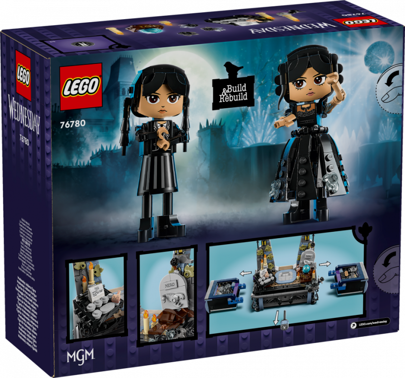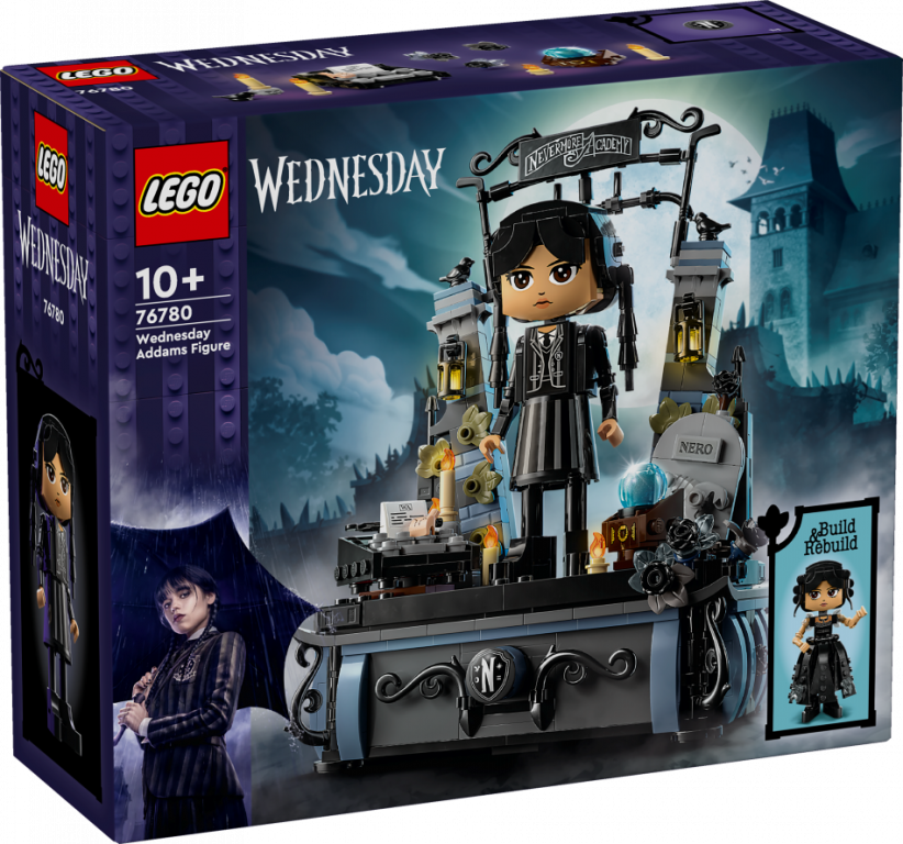 Bērnus no 10 gadu vecuma sagaida mistērija un nemiers Wednesday Addams figūras (76780) komplektā. Šis LEGO Wednesday dāvanas komplekts ietver kolekcionējamu, kustīgu modeli ar kustināmu galvu, rokām un kājām, kā arī 2 sejas un 2 tērpus, lai figūru varētu pārbūvēt. Komplektā ir viņas lojālais draugs Thing, statīvs ar melnām rotaļu dālijām un 2 slēptas vietas, kur glabāt dejošanas kleitu vai skolas uniformu. Ir iekļauti arī Nevermore akadēmijas vārti un tādi piederumi kā rakstāmmašīna, Nero kaps, kristāla lode un citi.