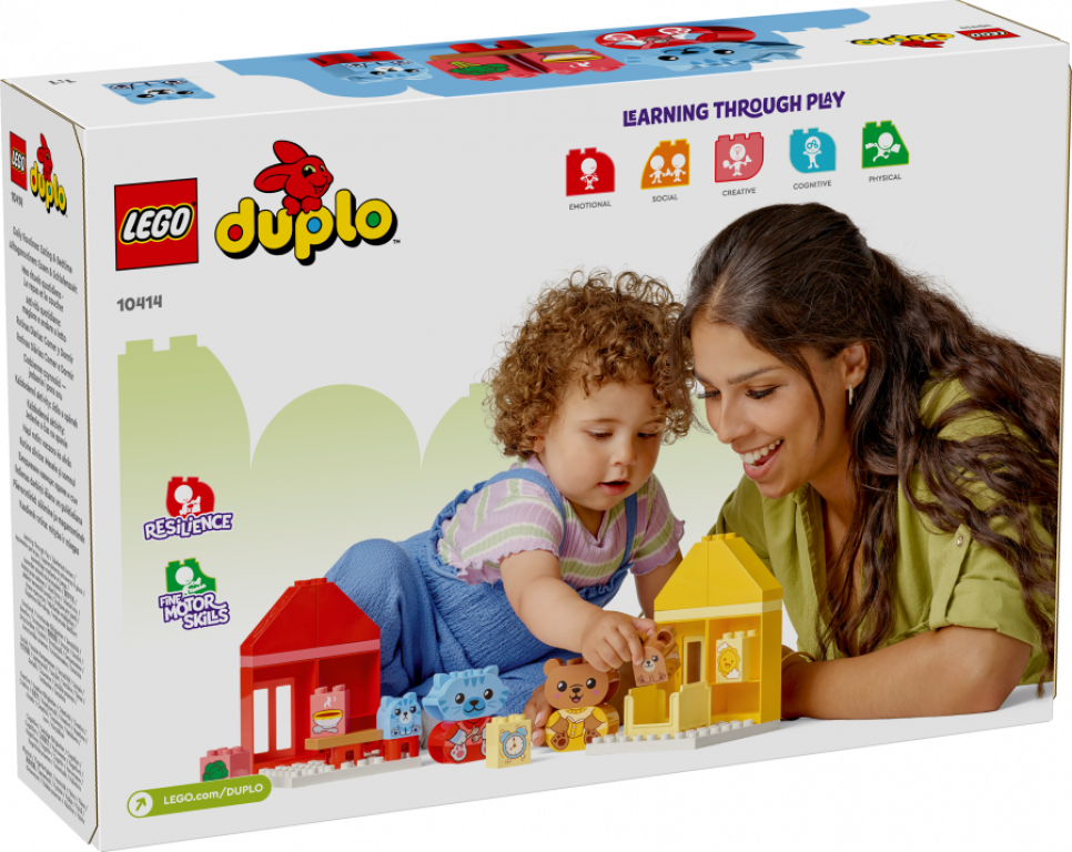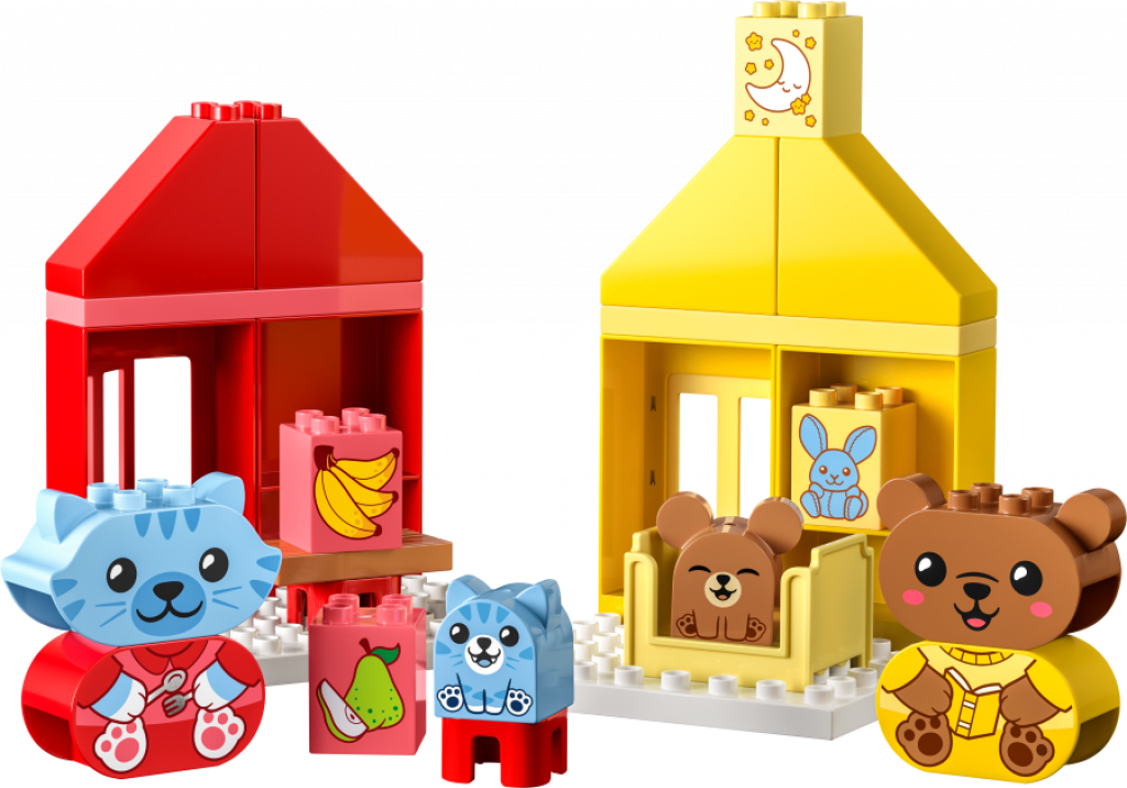 Gulētiešana un ēšana mazajiem var būt emocionālas nodarbes, taču šī mācību rotaļlieta mazuļiem ļauj šo nodarbju laikā izrādīt savas sajūtas. Komplektā ir iekļautas 2 piemīlīgu dzīvnieku ģimenes, no kurām katra ietver pieaugušo un mazuli. Kaķēna un lācēna figūrām līdzi nāk sejas izteiksmju klucīši ar divām emocijām – prieku vienā pusē un skumjām otrā –, tāpēc mazuļiem, kuri vēl nerunā, ir viegli izrādīt savas emocijas.