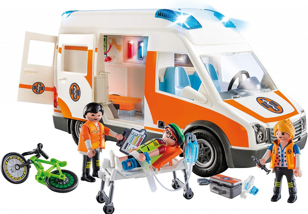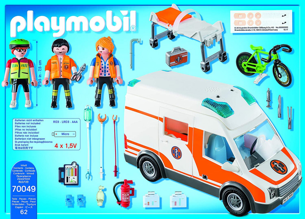 В набор входят три фигурки, носилки, велосипед, медицинская доска, бинты и другие аксессуары.