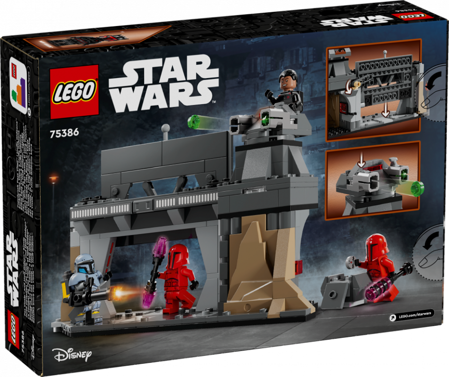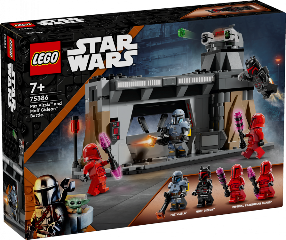 Uzbūvē leģendārā seriāla Star Wars: The Mandalorian 3. sezonas dramatisko ainu ar LEGO® Paz Vizsla™ un Moff Gideon™ kaujas komplektu (75386) zēniem, meitenēm un ikvienam fanam no 7 gadu vecuma. Šis no LEGO klucīšiem būvējamais rotaļu komplekts ir aizraujoša fantāzijas dāvana bērniem, tajā ir Mandalorian bāze ar bruņotām durvīm un aizcērtamu sprūdu, kontroles paneļi un rotējoša, funkcionāla revolvergalva. Ir arī 4 kolekcionējamas LEGO Star Wars: The Mandalorian minifigūras, ar ko izspēlēt Paz Vizsla cīņu pret Moff Gideon (kam mugurā ir Dark Trooper bruņas) un Impērijas Praetorian Guards, kā arī tādi piederumi kā Moff Gideon reaktīvais pacēlājs un glabāšanas kaste, kurā ir termālā detonatora elements radošām rotaļām.