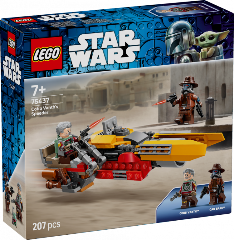 Apvieno spēkus ar Cobb Vanth spraigām cīņām pret Cad Bane šajā aizraujošajā LEGO® Star Wars™ transportlīdzekļu būvēšanas komplektā bērniem (75437). Uzbūvē detalizētu Cobb Vanth LEGO klucīšu modeli – aizraujošo ātrgaitas transportlīdzekli no Star Wars: The Mandalorian™ 2. sezonas. Tam ir vadītāja sēdeklis Cobb Vanth LEGO minifigūrai, piespraude viņa pistolei un slēpts nodalījums leģendāru piederumu novietošanai, tostarp Boba Fett ķiverei un zilā piena pakai. Iekļautā Cad Bane LEGO minifigūra ir aprīkota ar 2 blasterpistolēm un Cobb ir arī reaktīvais pacēlājs piedzīvojumiem gaisā. Jauka Star Wars™ dāvana zēniem, meitenēm un jebkuram Star Wars: Mandalorian vai Star Wars: Boba Fett™ fanam no 7 gadu vecuma – šī būvējamā rotaļlieta ir lielisksveids, kā rosināt bērnu iztēles ar rotaļām. Bērni var izbaudīt intuitīvu būvēšanu ar lietotni LEGO Builder — tuvināt un grozīt ar 3D instrukcijām, vienlaikus saglabājot progresu un sekojot tam līdzi lietotnē. Komplektā ir 207 detaļas.
