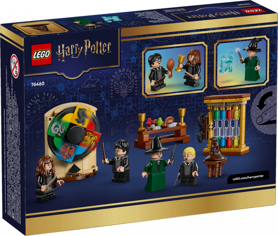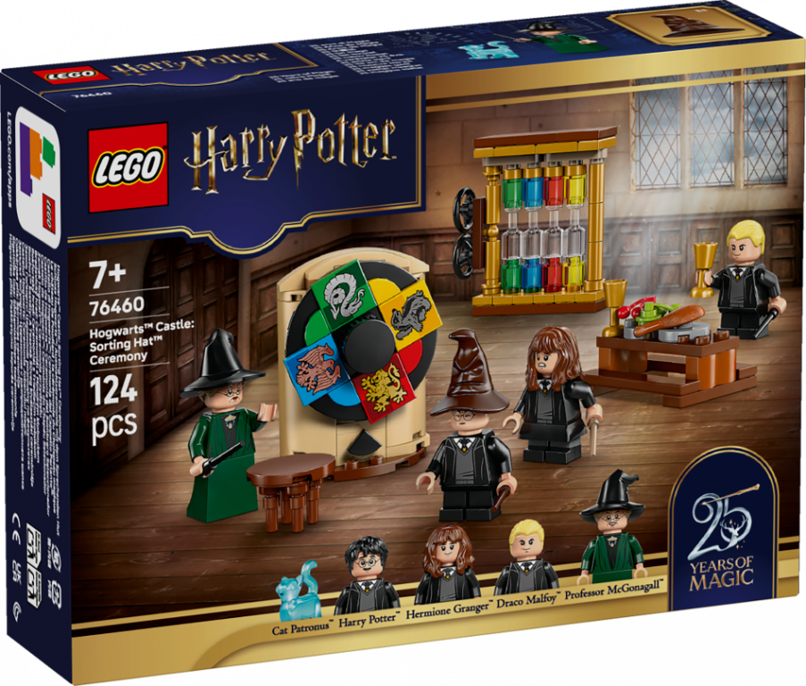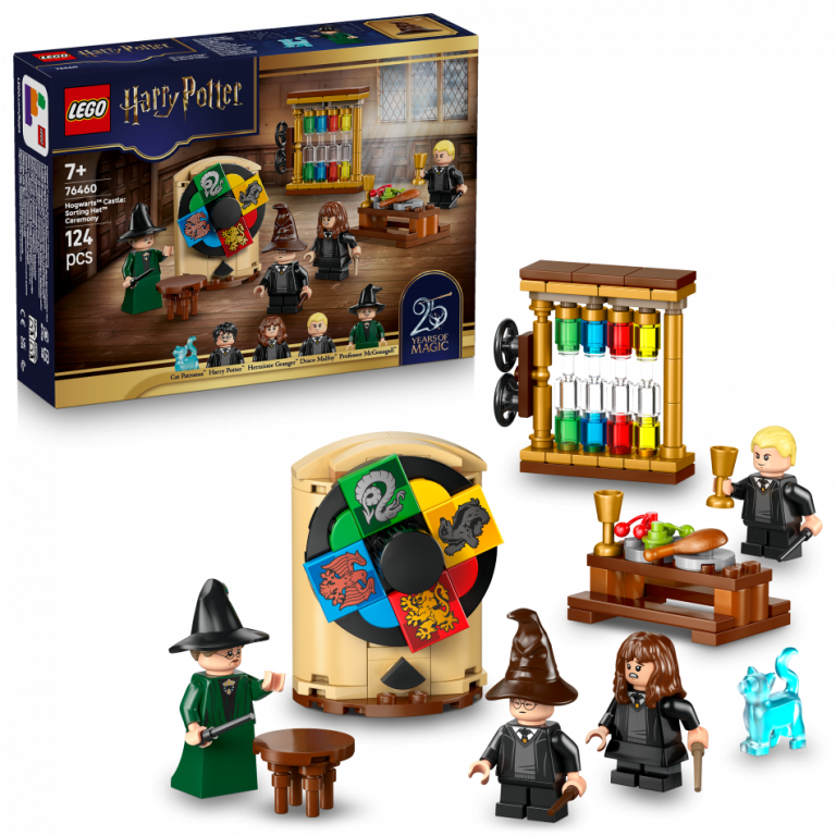 Izdzīvo Šķirmices ceremoniju Cūkkārpas pilī no filmas "Harijs Poters un Filozofu akmens" ar šo LEGO® Harry Potter™ būvēšanas komplektu (76460) bērniem. Aizraujoša dāvana par Harija Potera tematiku zēniem, meitenēm un faniem no 7 gadu vecuma, kurā ir 4 LEGO Harry Potter minifigūras. Profesore Maksūra, Harijs Poters, Hermione Grendžera un Drako Malfojs. Uzliec Šķirmici katra skolēna galvā un iegriez ’šķirošanas ratu’, lai atklātu, kuram Cūkkārpas tornim viņš vai viņa pievienosies. Rotaļu iespējasizvērš vakariņu galds un torņu punktu skaitītājs. Šis piedzīvojumu komplekts bērniem godina pašu pirmo LEGO Harry Potter komplektu (4701), kas tika izlaists 2001. gadā, un ietver vienu no 25. gadadienas kolekcionējamajiem aizstāvjiem – profesores Maksūras Aizstāvi kaķi. Šis komplekts der komplektā "Cūkkārpas pils: Lielā zāle" (76435) – vēl vienā komplektā no modulāro būvēšanas rotaļlietu kolekcijas (katrs jāiegādājas atsevišķi) – un tie kopā veido līdz šim pašu detalizētāko, no LEGO klucīšiembūvēto Cūkkārpas pils ainu. Komplektā ir 124 detaļas.