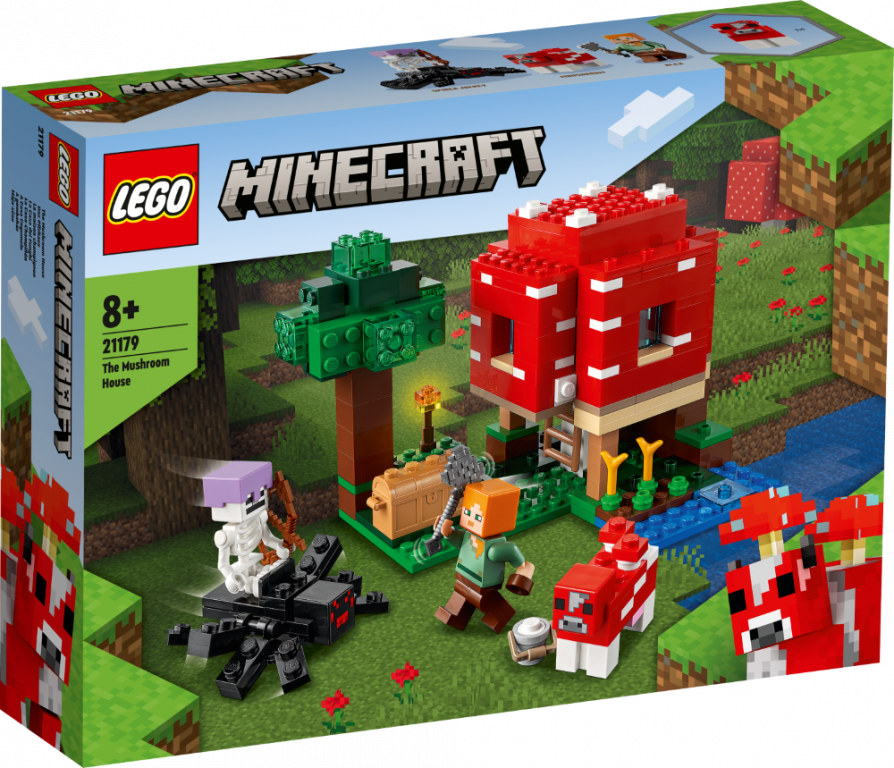 Aizved Minecraft® spēlētājus no 8 gadu vecuma uz citu dimensiju ar praktisko LEGO® Minecraft komplektu "Māja-sēne" (21179). Tas būs lieliska dāvana bērniem no 8 gadu vecuma. Minecraft jautrība mājā-sēnē. Minecraft spēlētāji var radoši darboties ar milzīgo māju-sēni. Tās sienas un jumtu var noņemt, lai iekšpusē ērti darbotos ar darbgaldu un mēbelēm. Ārā Minecraft varonis Alex izmanto bļodu, lai iegūtu sēņu zupu no Mooshroom govs. Tomēr plāni mainās, kad parādās skelets-zirnekļjātnieks. Kad bērni ienāk Minecraft mājā-sēnē, radošu rotaļu iespējas nekad nebeidzas.