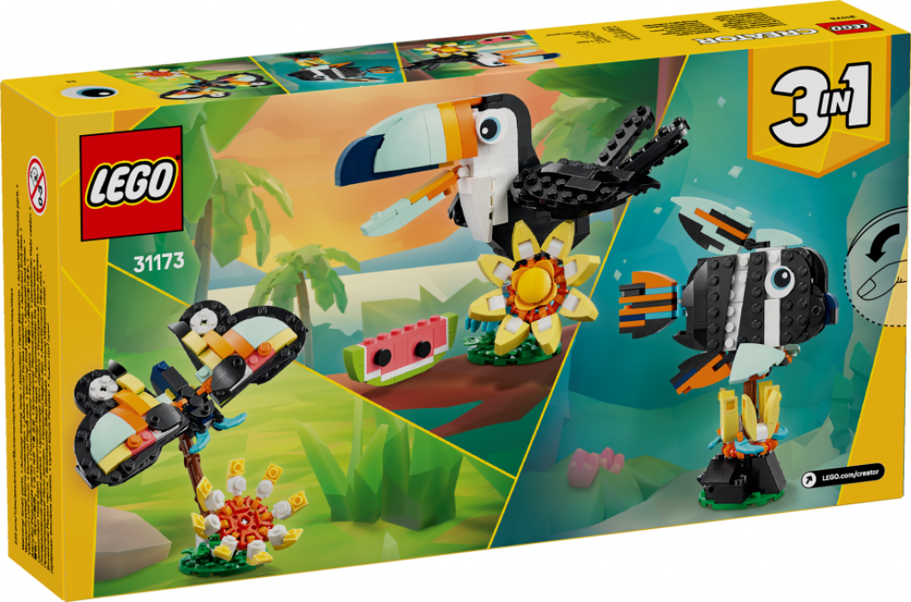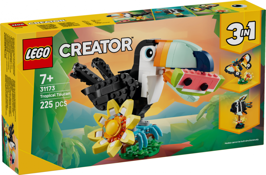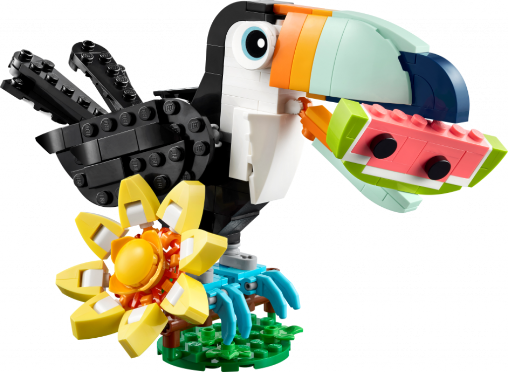 Bērniem ir 3 dažādas iespējas, kā uzbūvēt LEGO dzīvnieku komplektu no vieniem un tiem pašiem klucīšiem: kustīgs rotaļu tukāns ar arbūza daivu, ko var ielikt tā knābī; krāšņs rotaļu tauriņš ar kustīgiem spārniem, kas lido pāri zāles pleķītim ar ziedu, kā arī tropu zivs ar kustīgām spurām, ko var grozīt 360 grādos, uz jūras dibena pamatnes.
