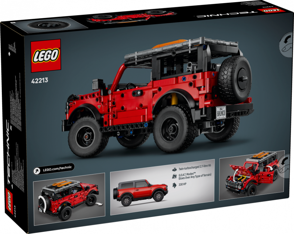 Iedvesmo bērnus sapņot grandiozi – ļauj viņiem uzbūvēt bezceļu piedzīvojumus ar LEGO® Technic Ford Bronco® apvidus auto (42213) modelīti zēniem un meitenēm no 9 gadu vecuma. Šis komplekts ietver reālistiskas detaļas, piemēram, atveramas durvis un piekari ar priekšējo asi un aizmugurējo asi.