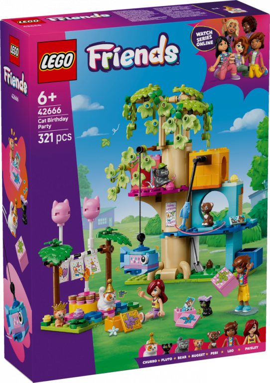 Atklāj lielisku būvēšanas komplektu meitenēm, zēniem un kaķu mīļotājiem no 6 gadu vecuma. LEGO® Friends Kaķu dzimšanas dienas ballīte un mājiņa kokā (42666) ietver 2 minilellītes, 5 kaķu figūras un daudzus piederumus radošām rotaļām, kas pildītas ar mīļiem brīžiem.