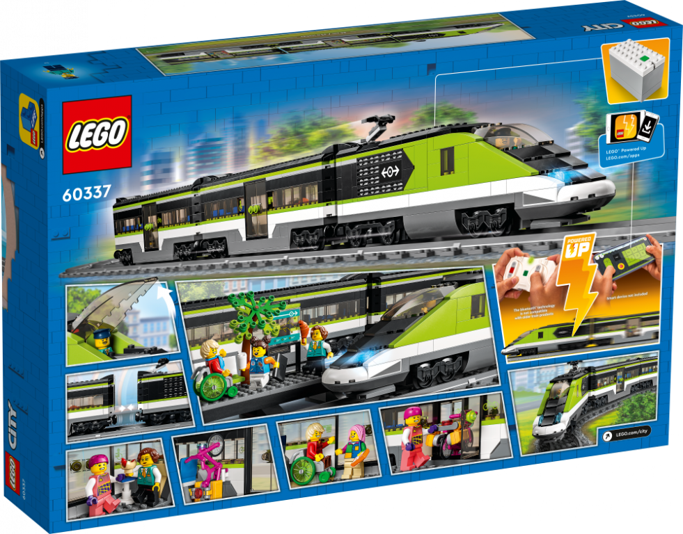 LEGO® City komplektā "Pasažieru ātrvilciens" (60337) ir iekļauta ar tālvadības pulti vadāma ātrvilciena lokomotīve ar LEGO Powered Up tehnoloģiju un funkcionāliem priekšējiem lukturiem, kuru spilgtumu var regulēt, kā arī restorāna vagons, pasažieru vagons, stacijas perons, 24 sliežu posmi un 6 minifigūras ar vilcieniem saistītām lomu spēlēm daudzu stundu garumā.