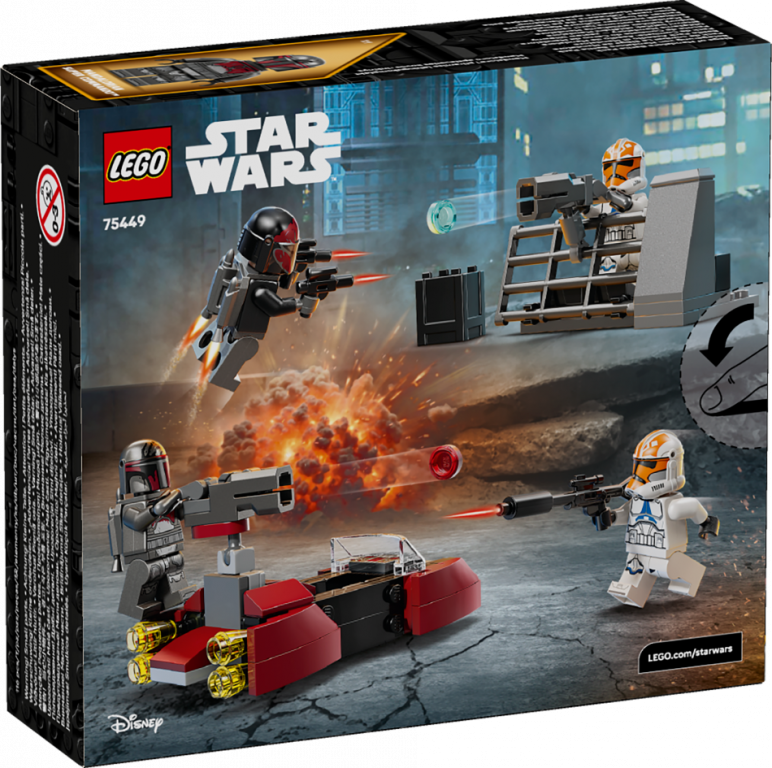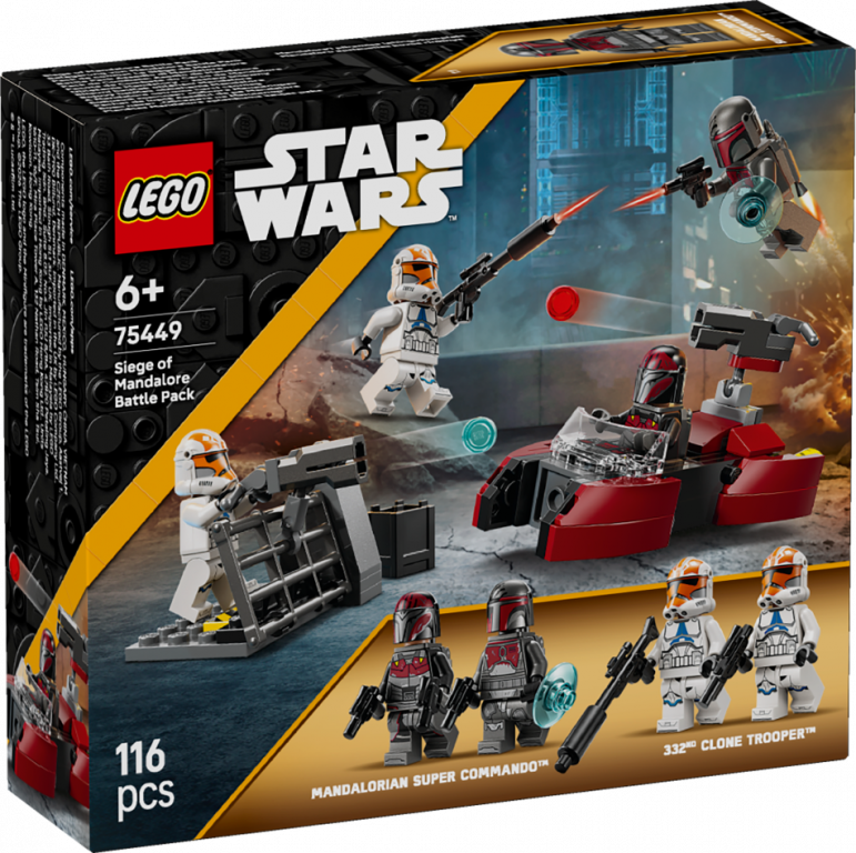 Iepriecini bērnus ar lielisku Kaujas paku (75449), lai izspēlētu pašiem savu planētas Mandalorian aplenkumu no Zvaigžņu kari: Klonu kari. Šajā būvējamajā rotaļu komplektā ir 4 LEGO® Star Wars™ minifigūras – 2 Mandalorian Super Commandos un divas 332. rotas Clone Troopers Ahsoka versijas, Mandalorian ātrgaitas transportlīdzeklis, Clone Troopers barikāde un daudz aksesuāru piedzīvojumiem pilnām rotaļām. Aktivizē ātrgaitas transportlīdzekļa šaujamieroci un raidi šāvienus ar šauteni, kas piestiprināta pie barikādes. Piesprādzē Commandos reaktīvos pacēlājus ar to blasterpistolēm. Šī būvēšanas rotaļlieta piedāvā daudz, lai rosinātu bērnu iztēles, un tā ir fantastiska dāvaniņa zēniem, meitenēm un jebkuram Star Wars fanam no 6 gadu vecuma. Kā arī izpēti citus Kaujas paku komplektus no klāsta (katrs jāiegādājas atsevišķi) vēl plašākām rotaļu iespējām. Bērni var būvēt ar pārliecību, izmantojot lietotni LEGO® Builder – tajā var tuvināt modeļus un sekot līdzi progresam ar viegli izpildāmām digitālām instrukcijām. Komplektā ir 116 detaļas.