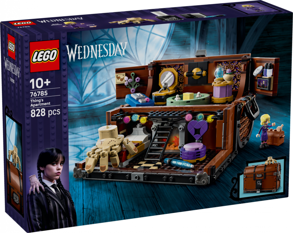 Nebeidzamas, pārnēsājamas rotaļas mājās sagaida seriāla Wednesday fanus no 10 gadu vecuma šajā LEGO® Wednesday detalizētajā, būvējamajā rotaļlietu komplektā "Thing dzīvoklis" (76785). Šis radošais rotaļu un apskates modelis ir aizraujoša dāvana dzimšanas dienā bērniem un ietver atveramu lādi, kurā ir gulta, krēsls, hūte un pulkstenis, vieta lādes augšpusē, kur turēt uzlīmes, laku un krēmu, un citas lietas. Kā arī kustīga Thing figūra un Enidas minilellītes figūra.