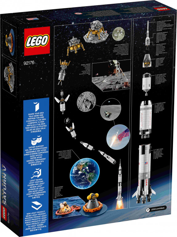 Tu esi dzimis, lai pētītu Visumu! Būvē un iedvesmo nākamās paaudzes astronautus ar LEGO® kosmosa raķetēm un transportlīdzekļiem. Uz priekšu! Izstādiet un spēlējiet lomu spēles ar šo iespaidīgo metru garo NASA Apollo raķetes Saturn V LEGO® klucīšu modeli. Tas aprīkots ar autentiskām detaļām — trīs noņemamiem raķetes posmiem, tostarp trešo posmu S-IVB ar uz Mēness nolaižamo aparātu un Mēness zondi. Komplekts ietver arī trīs statīvus, lai modeli varētu novietot horizontāli, trīs 2017. gada jūnijā izdotās kosmonautu mikrofigūras, lai iejustos lomu spēlēs ar nolaišanos uz Mēness, kā arī bukletu par Apollo misijām un šī izglītojošā un iedvesmojošā LEGO ideju komplekta dizaineriem.