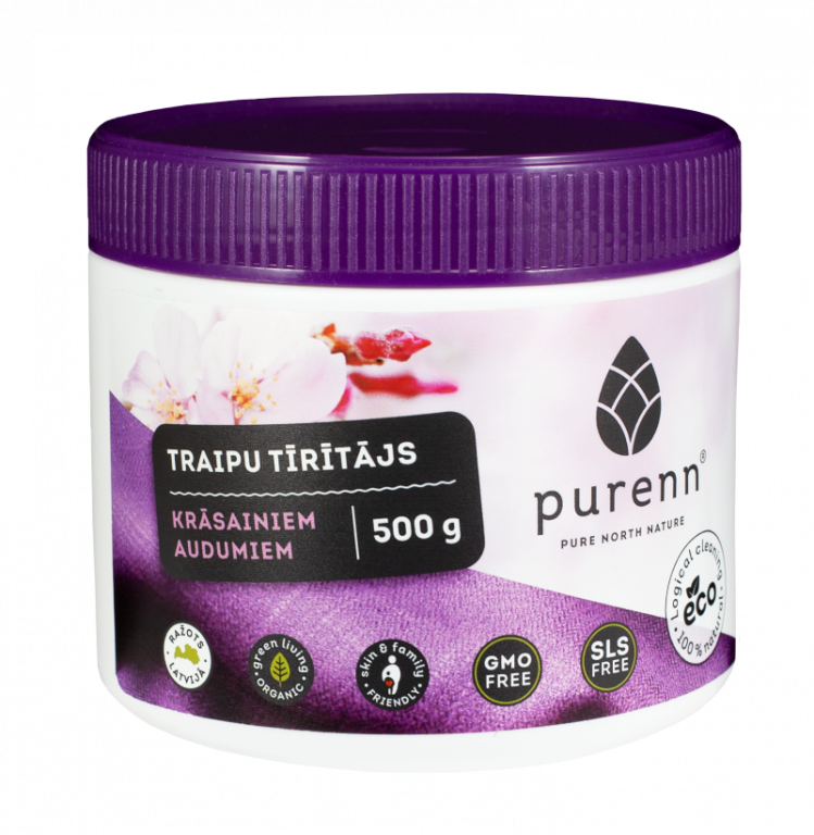 PURENN ekoloģisks skābekļa balinātājs un traipu tīrītājs krāsainai veļai ātri un efektīvi likvidē dažādu veidu traipus, piemēram, tējas, kafijas, augļu sulu, sarkanvīna, zāles u.c. Ieteicams pievienot PURENN veļas mazgāšanas līdzeklim. Piemērots mazgājamiem krāsu noturīgiem audumiem.
