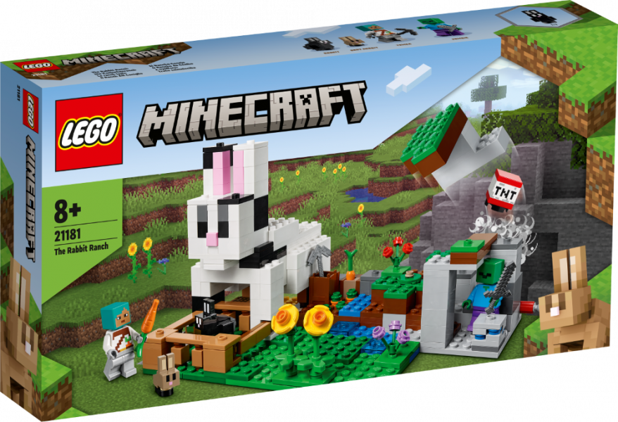 Игроки Minecraft® и любители кроликов в возрасте от 8 лет смогут наслаждаться бесконечной творческой игрой с набором «Кроличье ранчо» LEGO® Minecraft (21181). Стройте и сражайтесь, чтобы ухаживать за кроликами Дети строят огромное ранчо в виде кролика, чтобы заботиться о своих кроликах в Minecraft. Открытая задняя часть и съемная крыша позволяют легко расставить мебель и насладиться творческой ролевой игрой внутри. Снаружи есть два кролика, которых нужно кормить морковью, выращенной на соседней ферме. Рычаг сзади позволяет ребенку заставить кролика подпрыгнуть. В соседней пещере прячется легендарный враг из Minecraft — зомби. Вооружившись мечом, дети сражаются с ним, а потом возвращаются к своим драгоценным кроликам. Этот легко перестраиваемый набор вдохновляет на бесконечные творческие игры и дарит детям захватывающее удовольствие игры Minecraft.