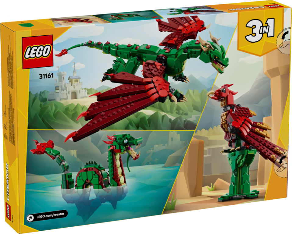 Iepriecini savu mazo ceļotāju laikā ar šo LEGO® Creator Viduslaiku pūķa (31161) rotaļlietu komplektu. Tajā ir pūķa figūra, kas ļauj zēniem un meitenēm no 9 gadu vecuma lomās izspēlēt aizraujošus viduslaiku piedzīvojumus. Tam ir pāris lielu, kustīgu spārnu, ko kustināt augšup un lejup, salocīt un uzvērst, kā arī kustīgas potītes, kāju pirksti, kakls, žoklis, gurni un pleci. Papildu rotaļu vērtībai tajā ir arī dārgumu lāde.