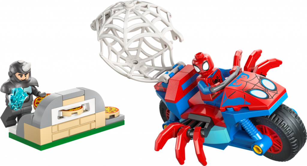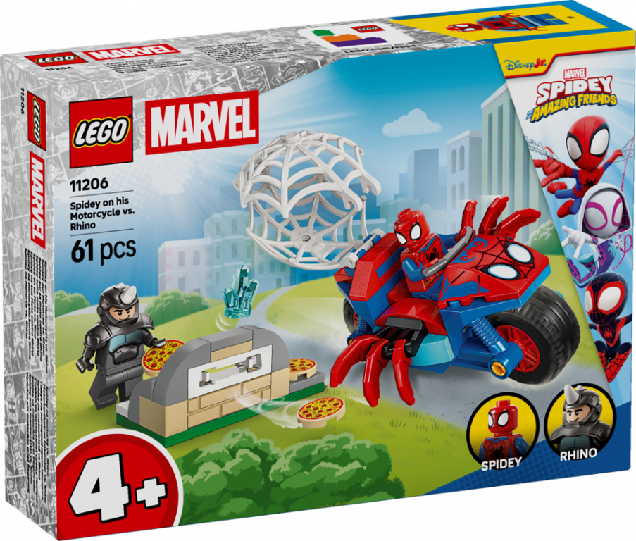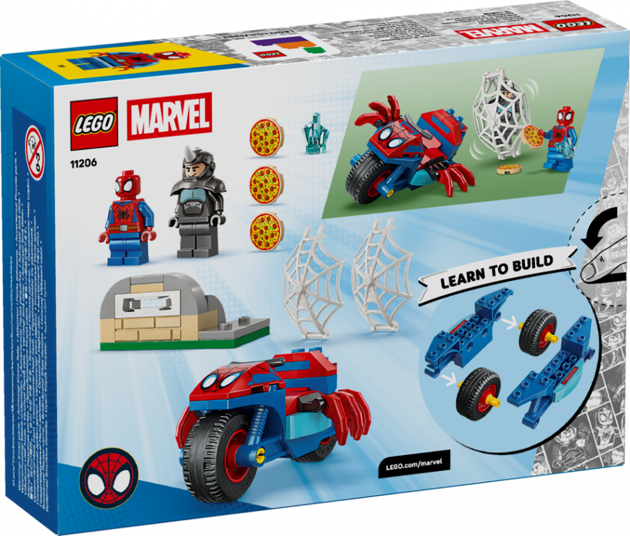 Nodod supervaroņu piedzīvojumus bērniem ar būvējamo rotaļlietu "Spidey uz motocikla pret Degunradzi" (11206) zēniem un meitenēm no 4 gadu vecuma Šis Spidey būvēšanas komplekts ar Spidey un Degunradža minifigūrām un motociklu zirnekļa formā ir lielisks veids, kā palīdzēt bērniem attīstīt radošās prasmes. Bērni palīdz Spidey atgūt nozagto, zilo dārgakmeni, izvairīties no lidojošajām picām, ko Degunradzis raida ar picu šāvēju, un sagūstīt Degunradzi milzu zirnekļtīklā – kas arī der uz motocikla. Šis būvēšanas komplekts ir izstrādāts, padomājot par mazajiem būvētājiem, un tajā ir daudz detaļu, kas rosinās nebeidzamas, radošas rotaļas. Tā ir lieliska dāvana dzimšanas dienā vai jebkurā citā notikumā seriāla Spidey And His Amazing Friends faniem. Komplektā ir krāsainas instrukcijas attēlu formā, liels Sākuma klucītis un atsevišķas paciņas ar vienu būvējamo modeli katrā, ar ko būvēšanu padarīt ātru un aizraujošu. Lietotnē LEGO® Builder bērni var tuvināt, grozīt modeļus trīs dimensijās un sekot līdzi savam progresam ar viegli izpildāmām digitālām instrukcijām. Komplektā ir 61 detaļa.