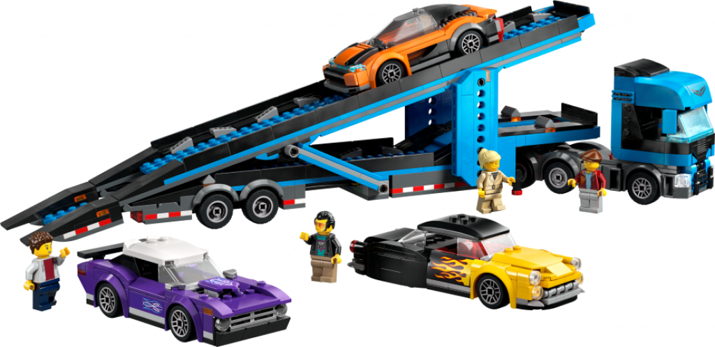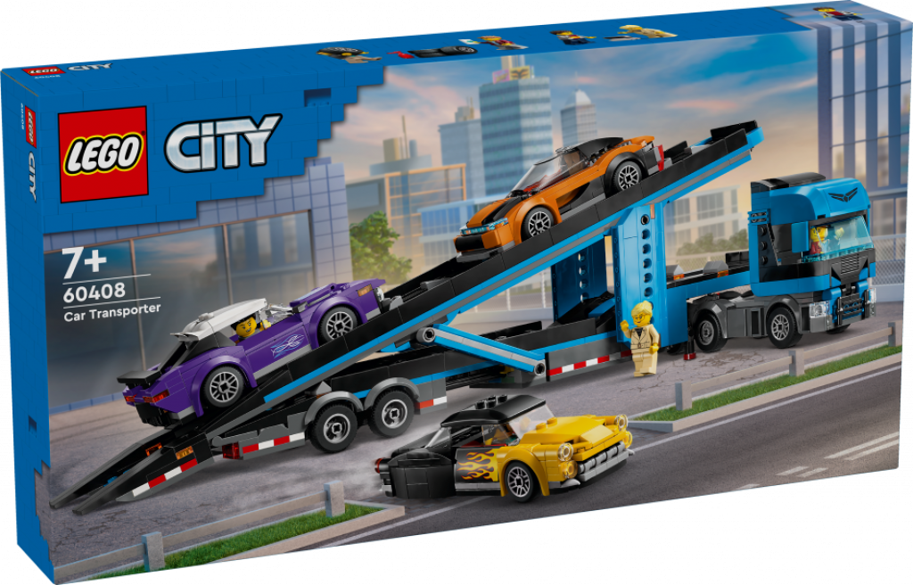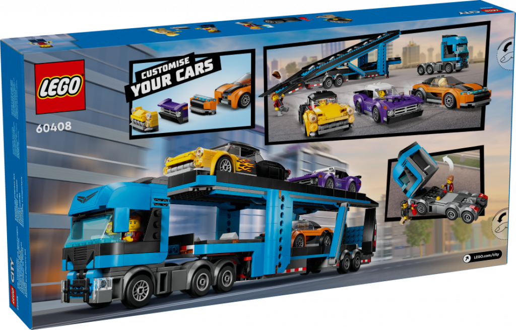 Iepriecini rotaļu auto entuziastu ar LEGO® City būvēšanas komplektu "Autopārvadātājs ar sporta auto" (60408) bērniem no 7 gadu vecuma, kas ietver vairākus transportlīdzekļus. Bērni var paliekt vadītāja kabīni, kas ļaus piekļūt dzinējam, piestiprināt piekabi un pazemināt tās augšējā un apakšējā līmeņa rampas, lai uz pārvadātāja nogādātu iekļauto 50. gadu stila auto, jaudīgo 70. gadu auto un moderno superauto. Šis iespaidīgais rotaļu transportlīdzekļu pārvadātāja komplekts ietver 4 minifigūras radošām rotaļām un stāstu veidošanai.