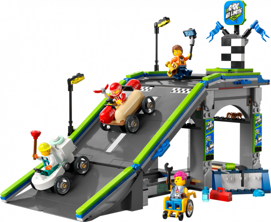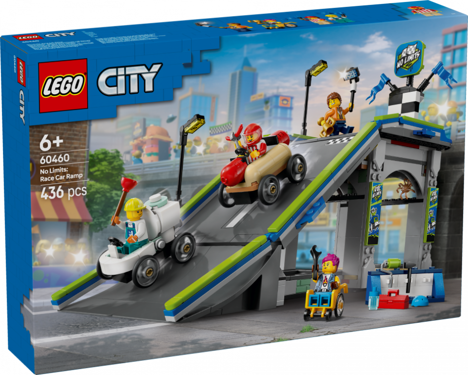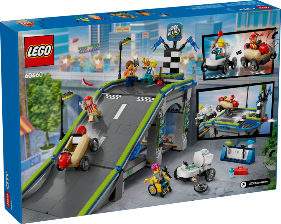 Pastiprini bērna rotaļu prieku ar LEGO® City komplektu "Bez robežām: Sacīkšu auto rampu celiņš" (60460) bērniem no 6 gadu vecuma. Šis dinamiskais “ziepju kastu” sacīkšu komplekts ietver augstu rotaļu auto rampu un 2 unikālus sacīkšu transportlīdzekļus – “ziepju kastes”. Vēro, kā bērni novieto interesantos auto hotdoga un tualetes formās rampas virsotnē un nospiež sviru, lai palaistu tos lejup no starta līnijas. Kopā ar ar 4 minifigūrām, tostarp hotdogu pārdevēju un santehniķi, šis komplekts rosina tēlainas rotaļas un stāstu veidošanu.
