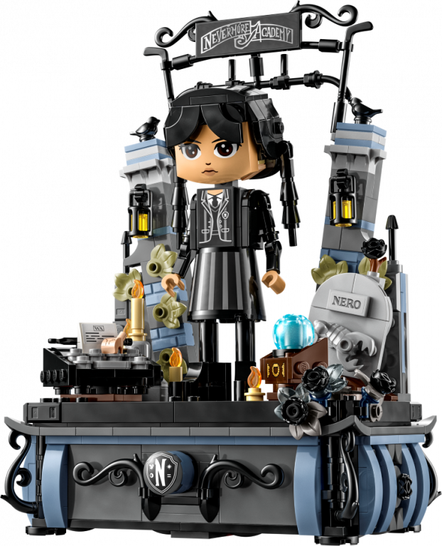 Bērnus no 10 gadu vecuma sagaida mistērija un nemiers Wednesday Addams figūras (76780) komplektā. Šis LEGO Wednesday dāvanas komplekts ietver kolekcionējamu, kustīgu modeli ar kustināmu galvu, rokām un kājām, kā arī 2 sejas un 2 tērpus, lai figūru varētu pārbūvēt. Komplektā ir viņas lojālais draugs Thing, statīvs ar melnām rotaļu dālijām un 2 slēptas vietas, kur glabāt dejošanas kleitu vai skolas uniformu. Ir iekļauti arī Nevermore akadēmijas vārti un tādi piederumi kā rakstāmmašīna, Nero kaps, kristāla lode un citi.