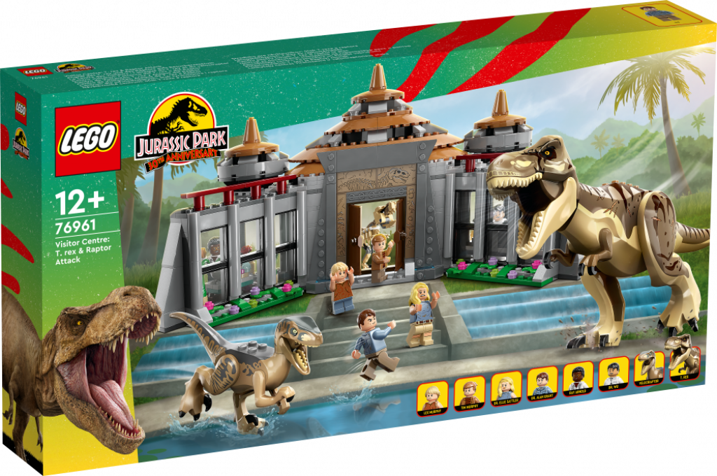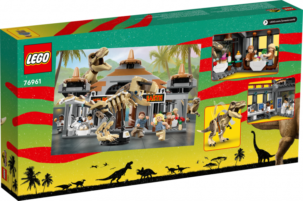Izdzīvo dramatiskās “Juras laikmeta parka” ainas ar šo kolekcionējamo, no klucīšiem būvējamo LEGO® Jurassic World rotaļu un apskates komplektu "Apmeklētāju centrs: Tiranozaura un Plēsēja uzbrukums" (76961) bērniem no 12 gadu vecuma. Apmeklētāju centra raksturīgā arhitektūra ir atveidota LEGO stilā, priekštelpa, virtuve/ēdamzāle un laboratorija ir atdalītas ar daļēji caurspīdīgiem ekrāniem ar dinozauru attēliem. Novieto uzbūvējamo T. rex skeletu priekštelpā un liec atvērties uzrakstam “Kad dinozauri valdīja pār pasauli”, kamēr cīnās pozicionējamās T. rex un Velociraptora rotaļu figūras.