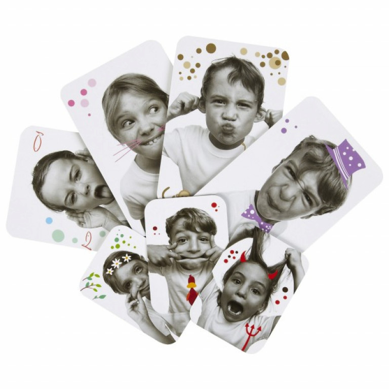 Для этого в набор входит 72 карты разного назначения: 36 больших карт и 36 маленьких. Колода позволяет играть двумя командами по два человека или нечётному количеству игроков. Большой картой в игре задаётся гримаса, маленькими картами - выбор игроков.